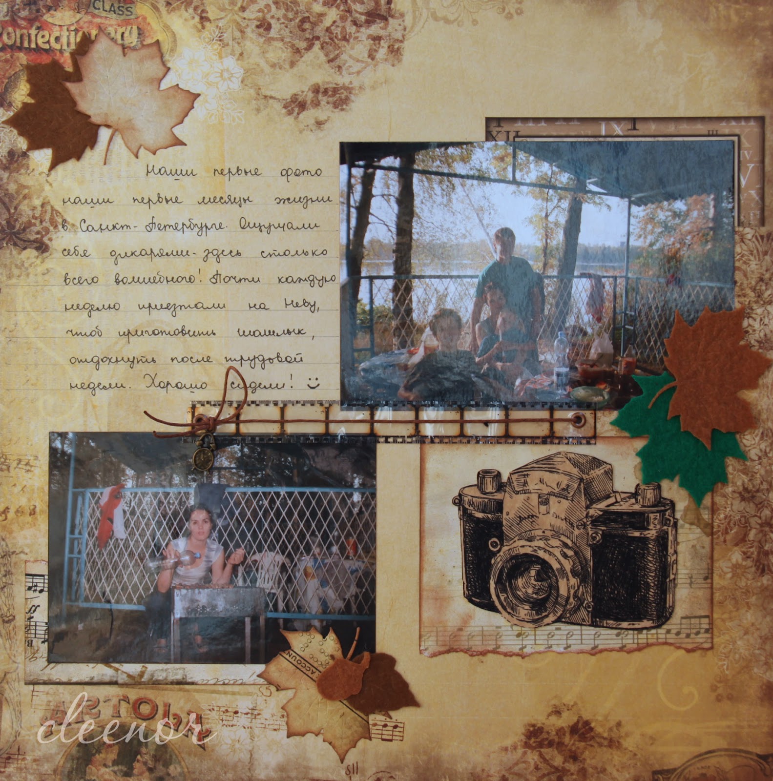 Основа странички лист Bo Bunny серии Weekend Market, в качестве подложек использованы листы из серии Et cetera , кинолента от ТН, вощеный шнур, подвеска часики, люверсы, листики - вырубки , фотоаппарат - натирка от KAISERCRAFT, всё затонировано чернилами Archival Ink Sepia , клей UHU универсальный прозрачный